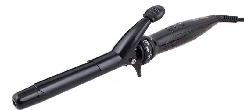 В отличие от предыдущих цилиндрических моделей, это коническая плойка — у нее разный радиус у кончика и основания. Такой прибор позволяет создавать естественные локоны с волнистой структурой — от 19 до 32 мм в диаметре. Температуру нагрева можно регулировать от 120 до 200 градусов, так что можно выбрать подходящий режим как для слабых, так и для здоровых волос.