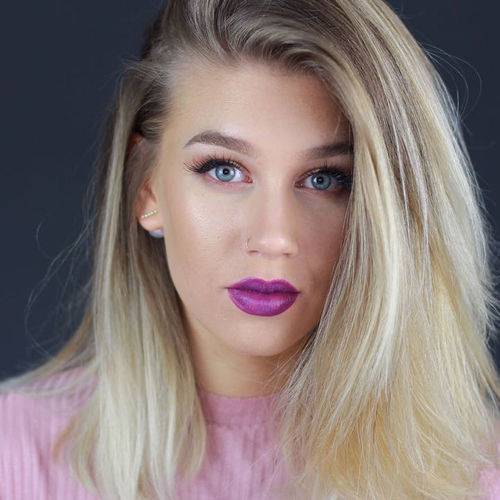 Блондинкам сиреневую помаду советуют использовать лишь в том случае, если глаза – голубые, серые или же серо-голубые, а волосы – с холодным пепельным подтоном, без золотистого сияния. С теплыми чертами фиолетовый не очень сочетается, несмотря на то, что одну из самых гармоничных цветовых пар он образует с желтым.
