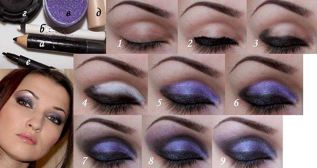 Подготовленное лицо перед нанесением декоративной косметики обязательно надо припудрить, так макияж продержится дольше и у него будет меньше шансов скататься или потечь. На верхнее веко от подбровного пространства до складки накладывают бледно-сиреневые тени и этим же цветом подводят нижнее веко под ресницами. Более тёмным тоном теней подводят подвижную область века, а линию роста нижних ресниц прорисовывают фиолетовым или чёрным карандашом.