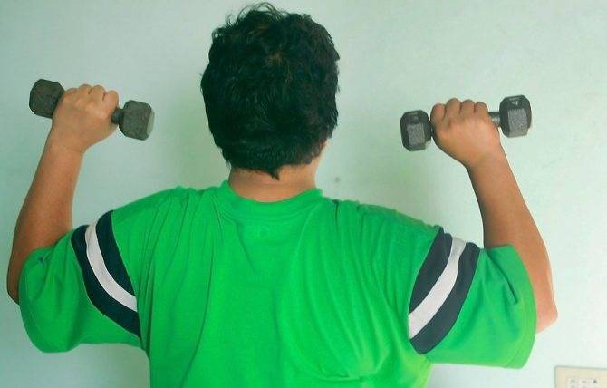 Шаг 4. Одно из упражнений – жим от плеч. Гантели нужно поднять до уровня плеч, а затем вытягивать руки вверх вместе с ними.