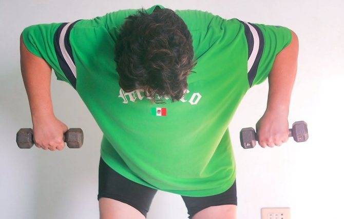 Шаг 6. Затем следует наклонить торс вперед и поднимать руки с гантелями, сгибая в локтях.