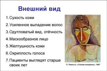 У больного понижается температура тела, а также замедляется пульс. Появляется некоторая заторможенность реакций, сонливое состояние, медлительность, ухудшение памяти и снижение мыслительных способностей. Кожа становится более сухой и ухудшается состояние волосяных луковиц.