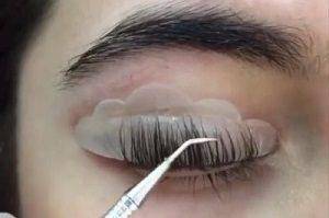 - Наложение на веки силиконовых форм, благодаря которым достигается изгиб ресниц, а также они защищают нежные веки;