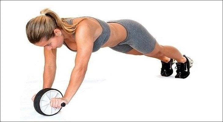 С роликом. Сядьте на колени, поставьте гимнастический ролик перед собой и упритесь в него прямыми руками. Спина прямая, поясницу можно немного прогнуть. Вдохнув, катим колесо вперед до максимальной растяжки корпуса. На выдохе возвращаемся в исходное положение.