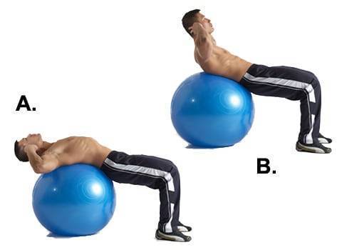 - Скручивания на фитболе – идеальны для людей со средней физической подготовкой и женщин после беременности.Исходное положение: сидя на фитболе, немного скатившись так, чтобы спина была на мяче. Руки у висков либо за головой. На выдохе торс нужно поднять вверх. Затем возвратиться в исходное положение