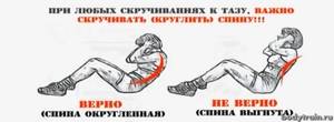 Основное правило — делать скручивания медленно, с небольшой амплитудой, избегая резких движений, со втянутым животом, задействуя все мышцы пресса.