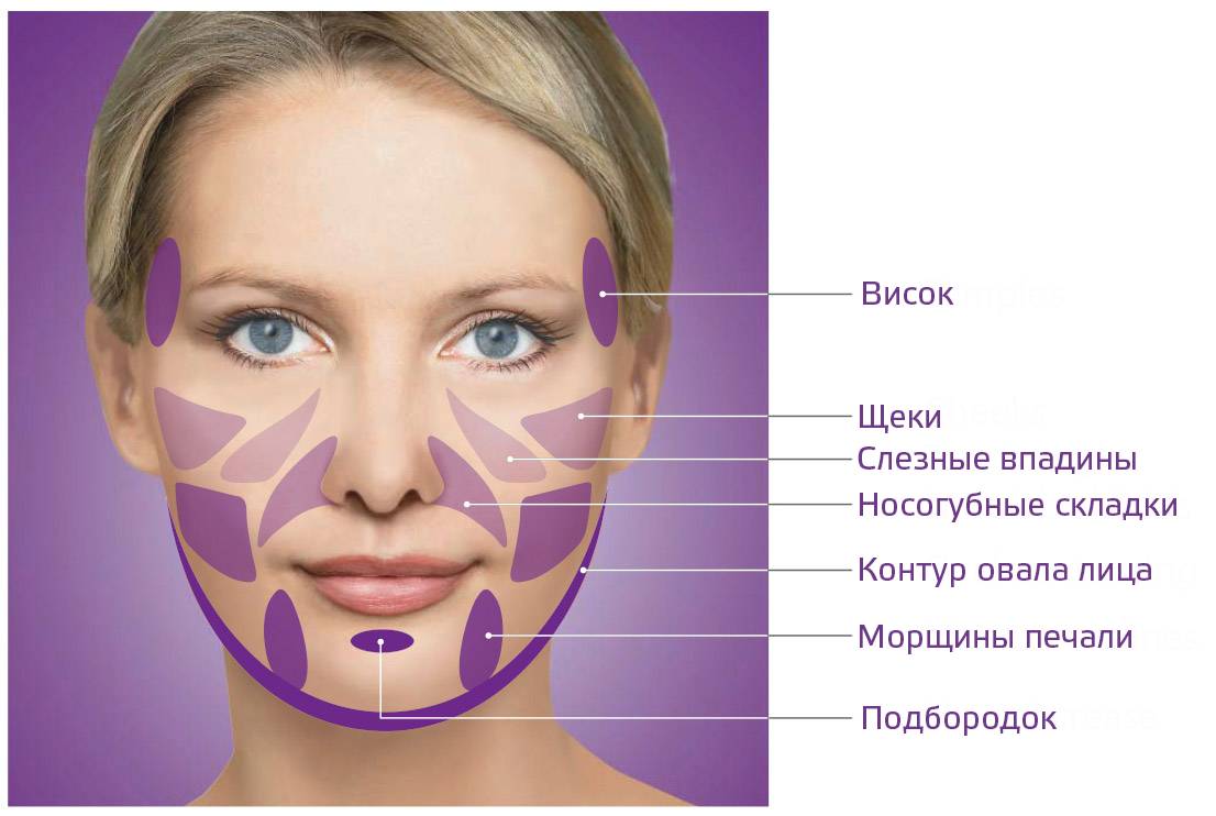 Зоны применения препарата Sculptra в области лица для омоложения и подтяжки кожи