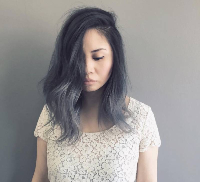 Модный вариант пепельного окрашивания на темные волосы – мраморная техника. Это довольно сложный в применении на практике способ, поэтому подобную процедуру предлагают только в салонах и только лишь опытные мастера. Необычный подход предполагает отбор отдельных прядей для неравномерного осветления. Волосы для обработки выбирают в хаотичном порядке, а локоны по длине прокрашивают неравномерно.