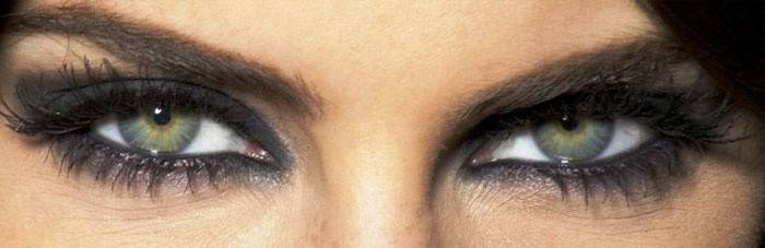 Линия роста верхних ресниц подводится мягким пудровым лайнером угольно-черного цвета. Поверх наносятся темно-серые или черные матовые тени. Распределять продукт удобно полужесткой плоской кистью из натурального ворса.