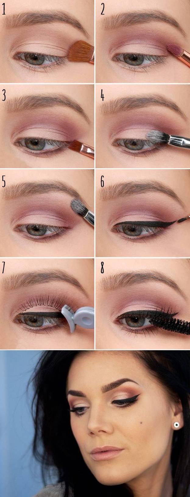 Можно сделать аналогичный макияж для серых глаз и темных волос, только вместо персикового оттенка лучше взять светло-сиреневый или холодный розовый.