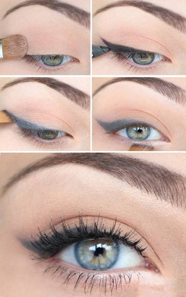 Наносим на лицо привычный для вашей кожи дневной крем. Через несколько минут (когда крем полностью впитается) выравниваем тон кожи тональным кремом. Если темные круги заметны, слегка тонируем их специальным корректором. Обводим линию вокруг глаз тонким черным карандашом. Стараемся сделать линию максимально ровной. Проводим ее как можно ближе к ресницам, чтобы она буквально сливалась с контурами глаз. Линию у внешних контуров слегка уводим вверх, делаем ее немного толще линии, которая расположена возле уголков. Выбираем самые темные тени (из трех оттенков, которые мы заранее отложили для работы). Наносим их на верхние веки при помощи кисти или аппликатора на карандашную основу. Наносим такие же темные тени на нижние веки – от внешнего края к внутреннему. При этом интенсивность цвета должна снижаться – возле внутренних уголков глаз оттенок должен быть мягким и ненасыщенным. Берем более светлые тени и плотно покрываем ими все верхнее подвижное веко. Для нанесения лучше использовать плоскую кисточку. Старайтесь сделать плавный переход между темными и светлыми тенями и растушевать черную линию карандаша. На внутренние уголки и под бровями нанесите светлые или белые перламутровые тени