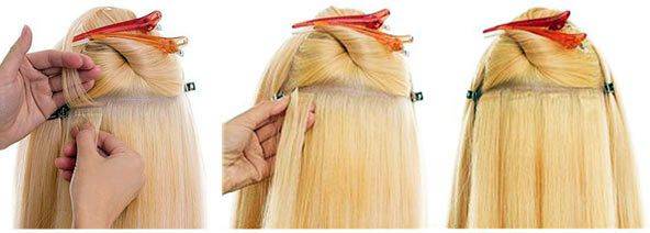 | Ленточное (голливудское) | Искусственные пряди присоединяются к натуральным волосам близко у корней при помощи тонких лент, с одной стороны смазанных клеем. По мере отрастания места крепления становятся очень видными. |