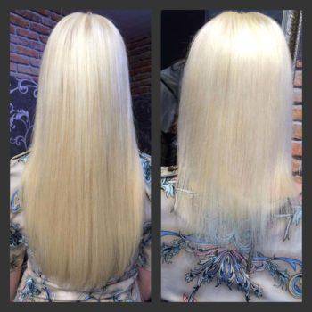 После замены кератиновых креплений, пряди у основания капсул завязать резинкой в хвост, помыть, обработать маской или бальзамом, высушить, выпрямить утюжком, если наращиваемые пряди были изначально прямыми. Волнистые и кудрявые достаточно просто высушить и обработать воском для придания текстуры.