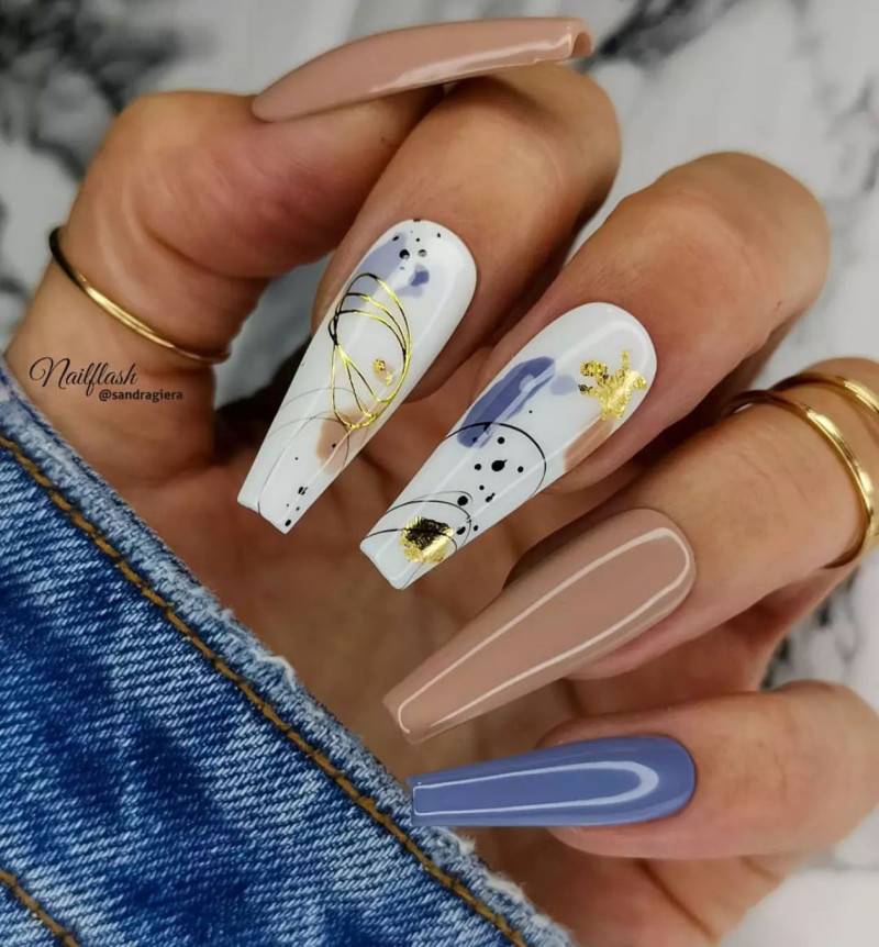Если вы любите синий цвет, но обстоятельства не позволяют покрыть им все ногти целиком, используйте хитрый ход и сделайте на пастельной основе рисунок в синих тонах.
