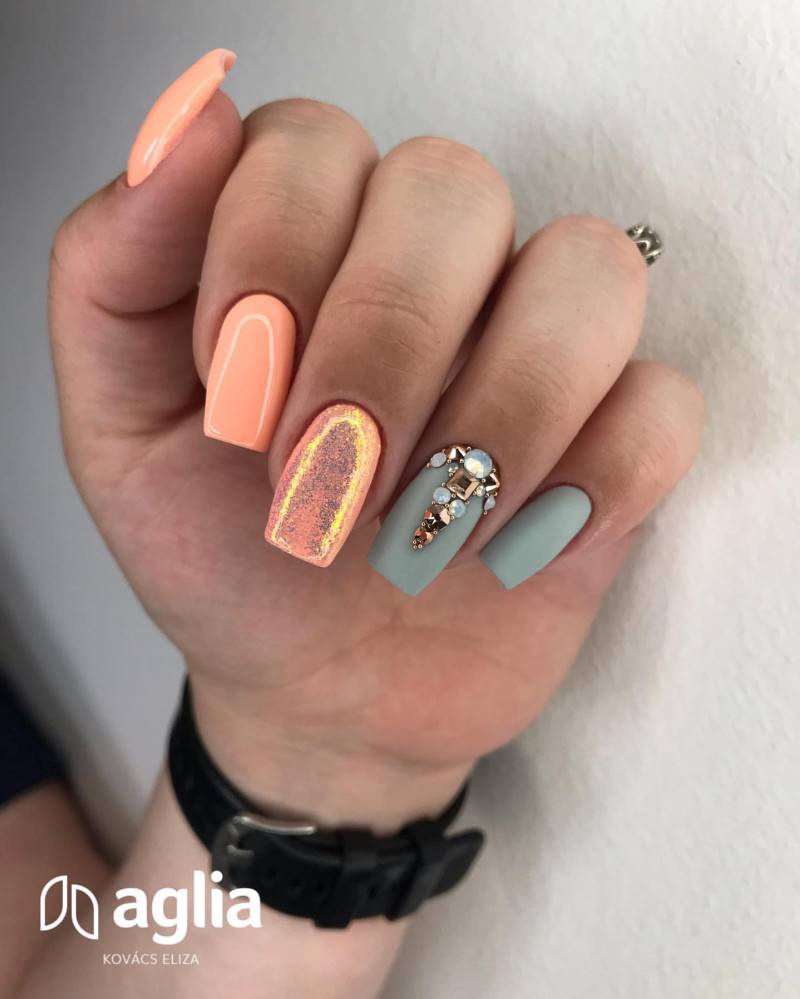 К зеленому платью идет коралл, оранжевые, желтые, голубые, розовые лаки