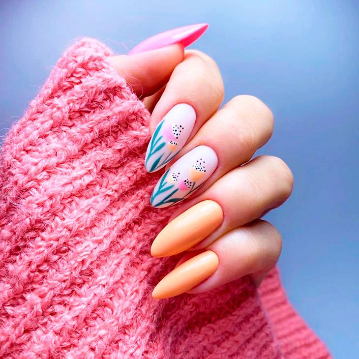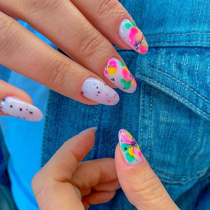 По-летнему теплый и нежный, очень романтичный, цветочный маникюр на разных руках предполагает, что одна рука будет моноцветная, а вторая будет светлее, с нанесением цветочного декора. Можно украсить ноготки наклейками, гелевой акварелью, прорисованным растительным орнаментом.