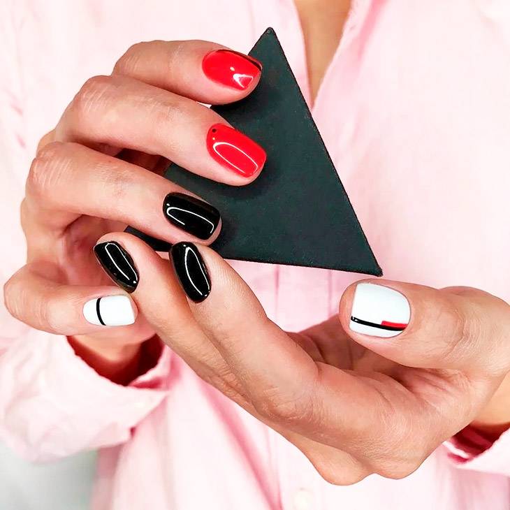 Яркое сочетается только с ярким! Это правило стоит всегда помнить, выполняя пестрый маникюр. грубой ошибкой будет комбинировать между собой классический красный цвет лака с пастельно-розовым или голубым. Другое дело, если к красному добавить выразительную фуксию и яркий цвет морской волны. Яркий маникюр, состоящий из трех оттенков, может быть следующего содержания: