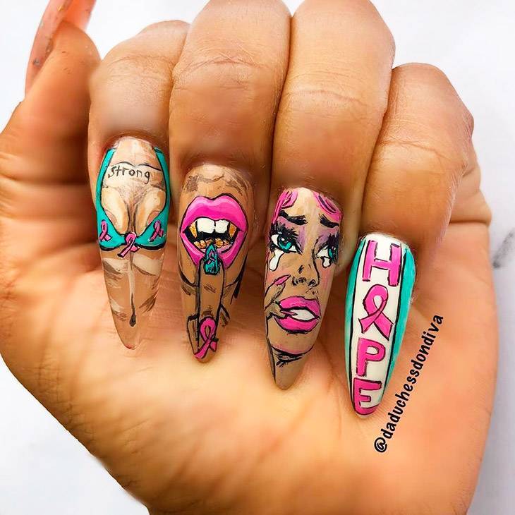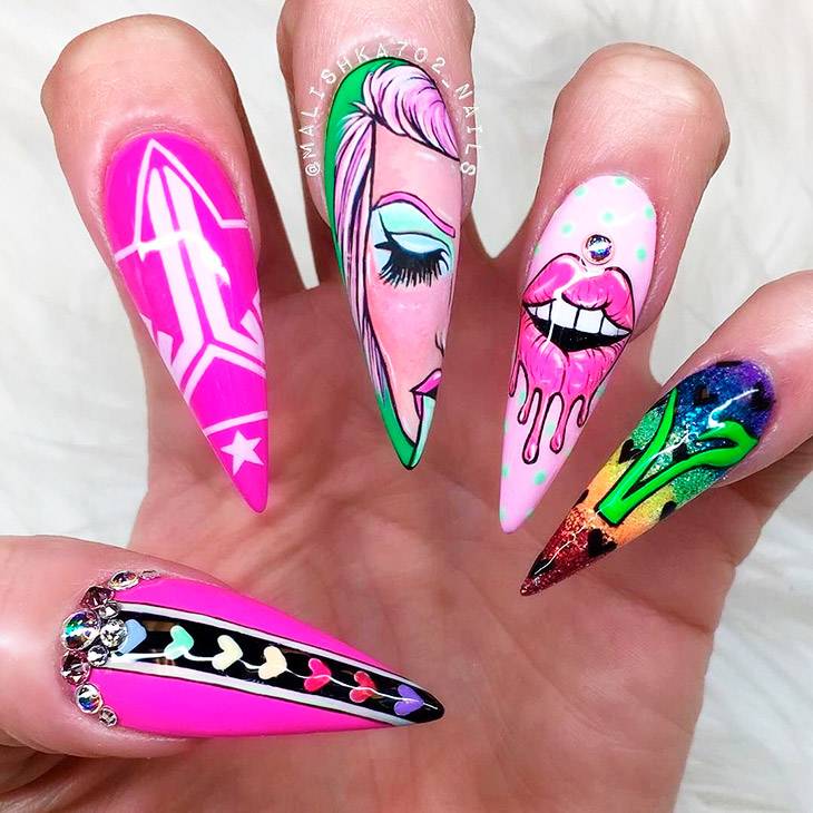 Элементы дизайна в стиле поп-арт как будто сошли со страниц комиксов – такого рода наклейки наносят на базовое покрытие ноготков при маникюре на разных руках, Чем ярче оно будет, тем лучше. Яркий желтый на одной, малиновый – на другой руке, эти и подобные им цвета под стать кричащему стилю поп-арт.