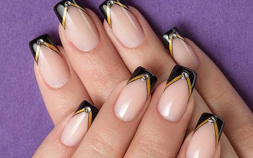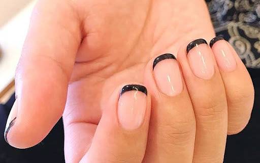 В современном французском маникюре наравне с пастельными тонам присутствуют контрастные, белая основа комбинируется с кончиками черного цвета.