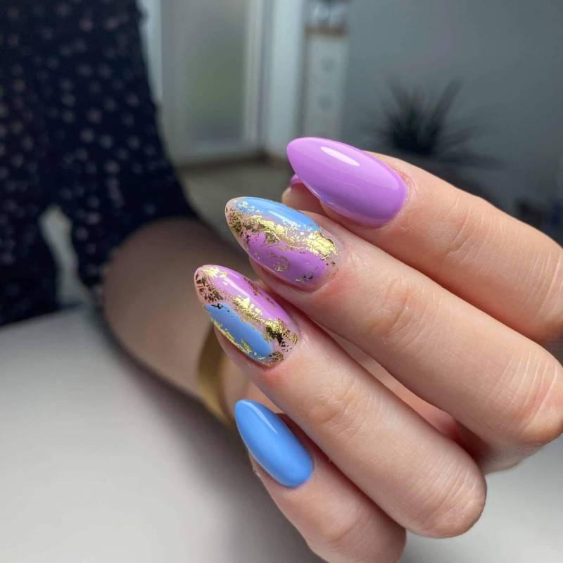 Трехцветный маникюр с аналогичными цветами.