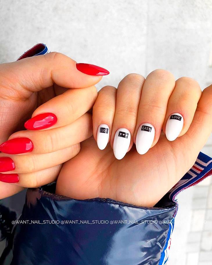 В топе выразительных средств разноцветного или двухцветного маникюра на разных руках наклейки с тематическими надписями, различными героями, сердечками, абстрактными мазками, точками, абрисами.