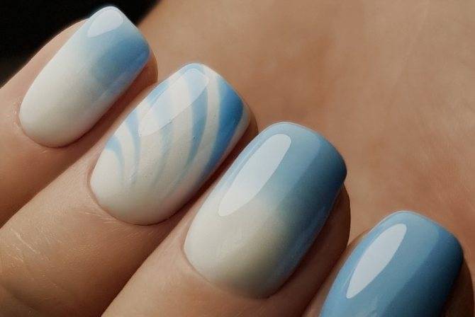 Если вы любите синий цвет, но обстоятельства не позволяют покрыть им все ногти целиком, используйте хитрый ход и сделайте на пастельной основе рисунок в синих тонах.