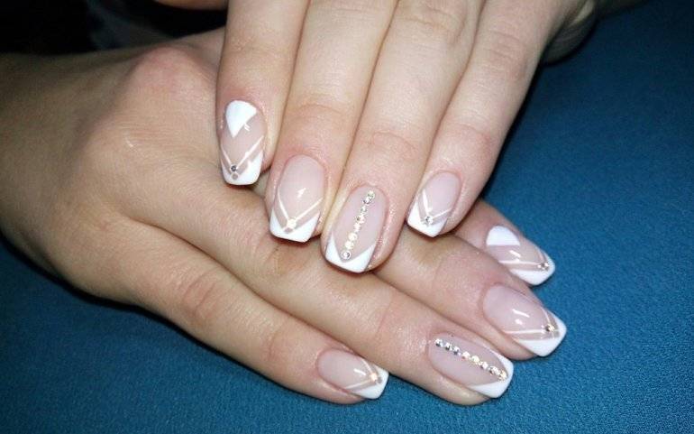 Не обойдем стороной и тему классических видов nail-дизайна, а именно французского и лунного маникюра. На сегодняшний день появилось множество различных комбинаций этих традиционных дизайнов. Часто в оформлении ногтей преобладают прямые геометрические линии. Стирается четкая грань между френчем и лунным дизайном, они могут быть скомпонованы в одном маникюре. Классический маникюр дополняют новыми аксессуарами для ногтей, выдумывают новые техники и т.д. Маникюр с синем цвете даже стилизованный под классику уже не выглядит уныло и скучно. Примеры вы можете увидеть на фото.