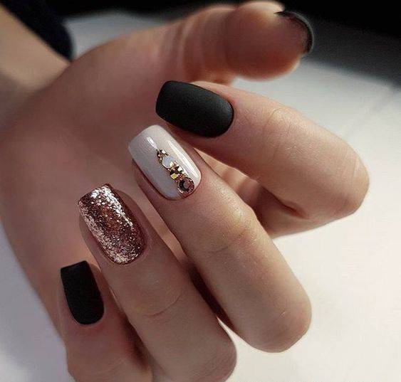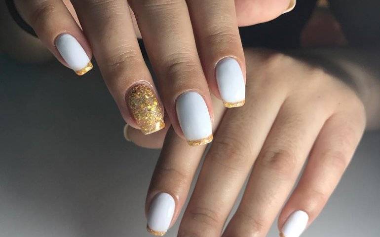 Трехцветный маникюр с блестками, имеющий два основных цвета — черный и белый, считается классикой. Яркий акцентный ноготь золотистого цвета покрыт втиркой. Это мельчайшая пудра, которую нужно насыпать на подготовленный ноготь, намазанный базовым слоем лака, и тщательно втирать пудру в глубину слоя. Это можно делать как широкой кистью, так и просто пальцем.