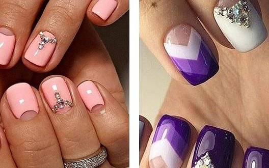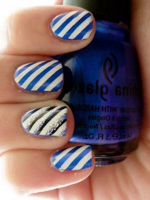 Как ни странно, но для коротких ногтей синий гель-лак тоже подходит. Только не нужно городить на ногтях слишком замысловатые рисунки. Лучше для декора использовать старые добрые стразы и блестки. Тем более что маникюр со стразами выполняется очень быстро и легко и не требует специальных навыков. Хорошо смотрятся короткие ногти с синим матовым маникюром. В дизайне лучше сочетать синий со светлыми оттенками, такими как белый, молочный, песочный, бежевый и т.д. Ноготь будет смотреться более длинным, если сделать полупрозрачный дизайн правильной формы. Линии в рисунке должны быть вертикальными.