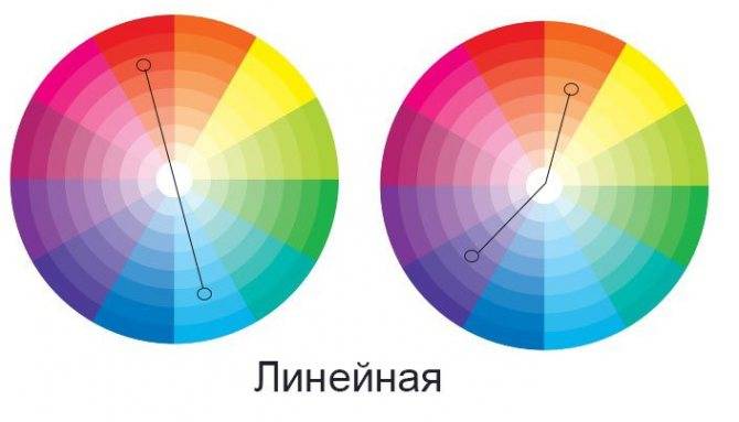 Во многих цветовых сочетаниях фигурирует дополнительная линейная схема. Чтобы создать маникюр с такой схемой, нужно взять три цвета в пределах одного цветового кольца. В дополнение к основному цвету идут цвета из правого и левого соседних секторов.
