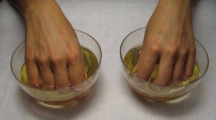 - Масло оливы (100 мл) требуется разогреть с использованием метода паровой бани. Внести в смесь по 3 капли сандала, бергамота и иланг-иланга. Опустить кисти рук в полученный раствор на 15 минут. Втереть целебный состав в кожу.