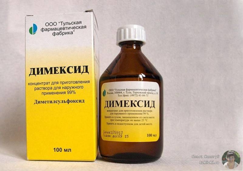 Концентрат наносят в виде компресса максимум на 30 минут. Более детальная инструкция есть тут. - Геля (содержание димексида 20% и 50%). Бесцветный или светло-желтый гель используют наружно при артрите, остеартрозе, ушибах, растяжениях, воспалительных заболеваниях кожи и акне. Наносят точечно тонким слоем. Применяют не более 14 дней. Более детальная инструкция есть тут.