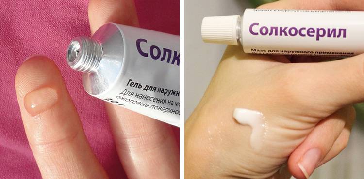 - После этого тонким слоем геля Солкосерил проходят по всем этим участкам. После нанесения не должно быть видно, что гель присутствует, т. е. кожа должна хорошо просвечивать.