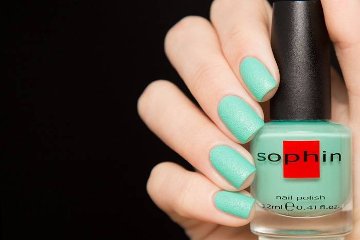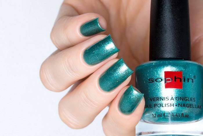 Не менее популярен мятно-бирюзовый оттенок, представляющий собой однородную кремовую структуру, не имеющий светоотражающих частиц и шиммера. Плотный слой получается в два слоя. Он становится похож на замазку, однако не оставляет полос и достаточно просто ложится на поверхность ногтя, причем не стягивая за собой первый слой.