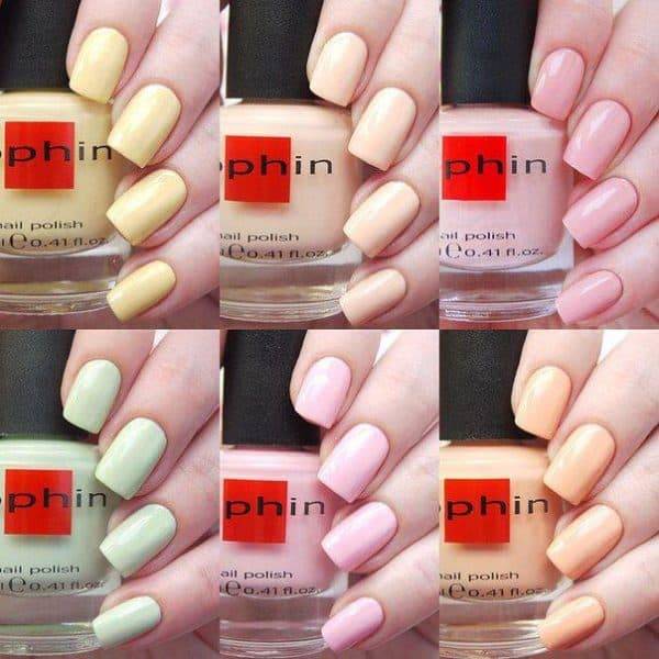Лаки пастельных тонов: мятно-бирюзового, небесного, ванильного, лилового. При нанесении создают идеальное матовое покрытие.