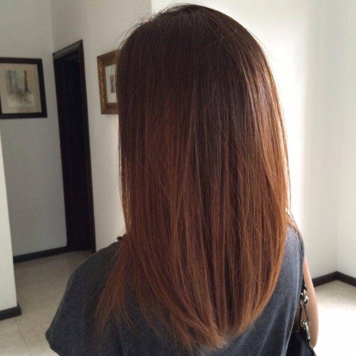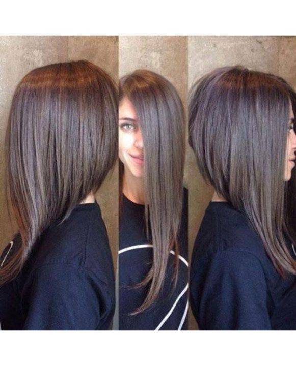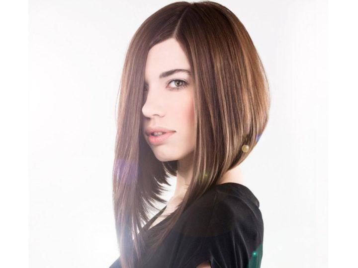 На первый взгляд схожа с длинным бобом. Затылочную часть немного срезают короче основной длинны прически. Создается мягкая переходная линия от укороченной задней зоны и удлиненных передних прядей. Косая челка делает образ более элегантным. Подходит всем типам лица, можно спрятать в прическу с помощью «невидимок». Минус этой прически в качественном уходе и необходимости ежедневной укладки.