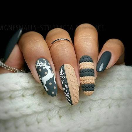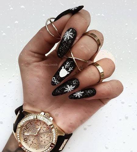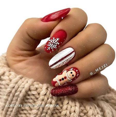 Как красиво сочетать цвета лаков и выполнять стильный новогодний дизайн на длинные ногти смотрите в нашей фотоподборке: