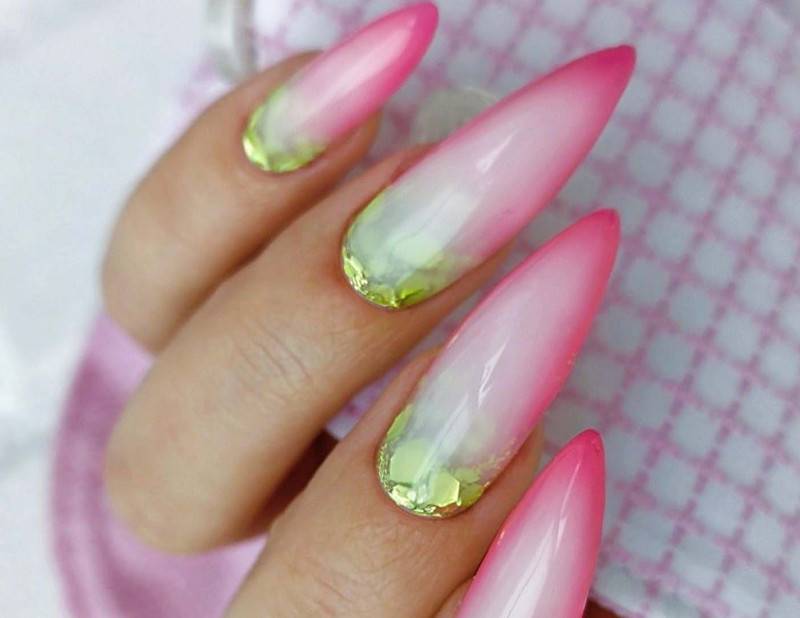 Если говорить о сочетании ярких красок на ногтях, стоит отметить что техника омбре в исполнении гель-лаком будет довольно популярна, поскольку постепенный переход допустим от темно-зеленого к светло-розовому оттенку смотрится довольно красиво и броско, а потому окружающие всегда будут обращать внимание на такой маникюр