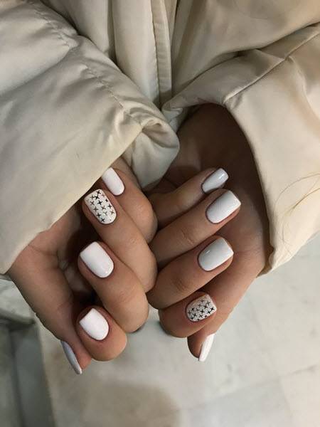 выделите под декор 1-2 пальца на руке – исключение могут составлять только сухие блестки, которые можно разместить в прикорневой зоне каждого ноготка используйте четкий, не крупный узор, который будет хорошо заметен на коротких ногтях уделите внимание оттенкам – например, светлый декор на темном фоне будет смотреться заметнее, также как и темный рисунок на светлом фоне откажитесь от объемного декора – шармов, лепнины, акриловой пудры, крупных стразов выбирайте простые узоры – в тренде звезды, снежинки, выкладка стразами и т.д
