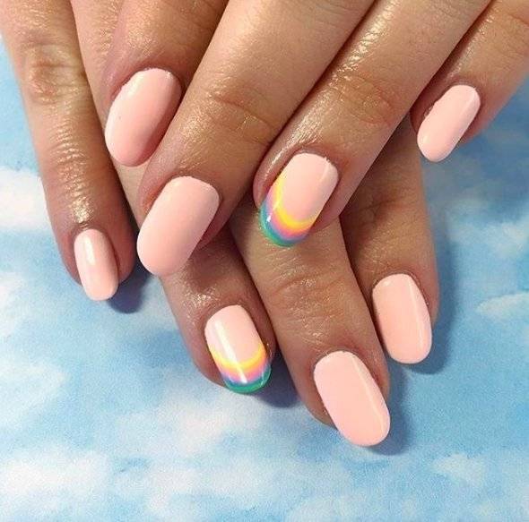сдержанные брызги. Мазки или капельки краски в летнем маникюре могут быть очень яркими или, наоборот, практически незаметными. Такой акцент на нежной базе подойдет сдержанным дамам или тем, у кого установлены жесткие требования на рабочем месте. Если выбираете декор мазки, можете просто сделать акцент посередине ногтя. Лучше вертикальный, он визуально сделает пластину длиннее и изящнее;