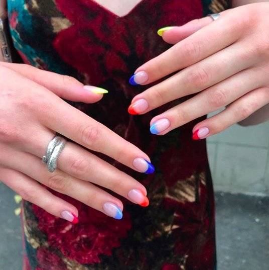 градиентные брызги. Да, есть и такие. Просто сделайте их более кучно у лунки и уменьшайте количество ближе к кончику ногтя. Для летнего маникюра подойдут любые яркие оттенки лака