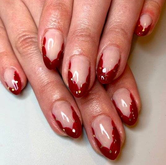 Классическими цветами для такого маникюра считаются: красный, фиолетовый, бордовый.