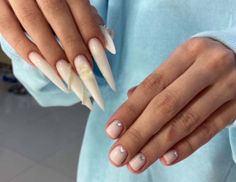 Смелые девушки могут экспериментировать с разной длиной ногтей на руках: на одной руке подстричь ноготки почти под ноль, а на второй оставить длинные ногти. Новинка в трендах в маникюра, которая плавно перекочевала из 2023 года, но будет актуальна и в 2024.
