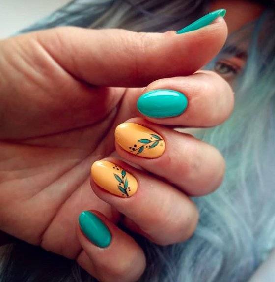 - Необычный маникюр различных ярких цветов: синий, салатовый, тифани, зеленый.