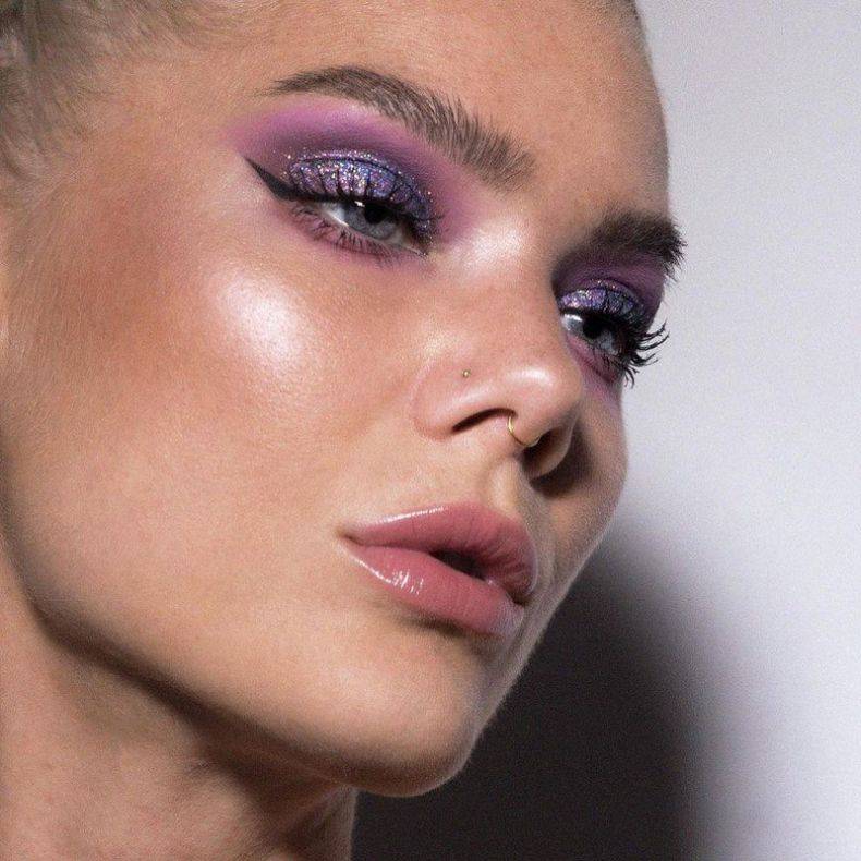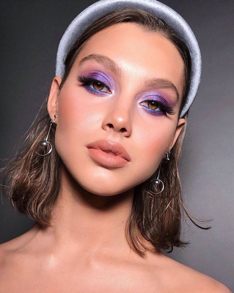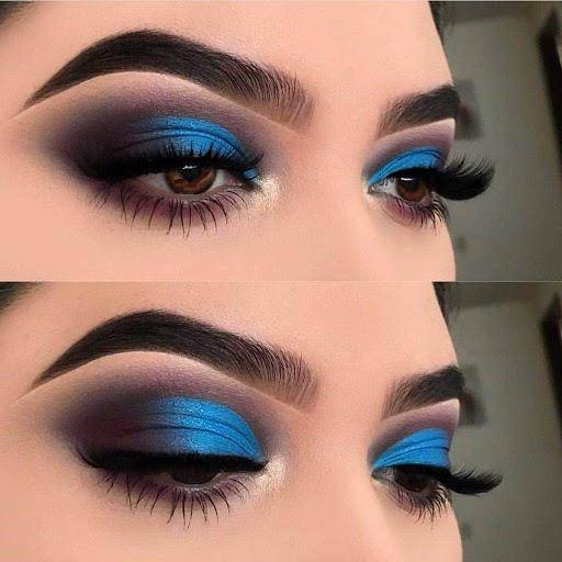Из доступных цветов чаще всего под синий подойдет вся палитра синего, фиолетовый, черный, белый, золотой, серебро, голографический, в некоторых случаях зеленый. Комбинация цветов приветствуется, поэтому база макияжа существенно расширяется по возможности выбора.