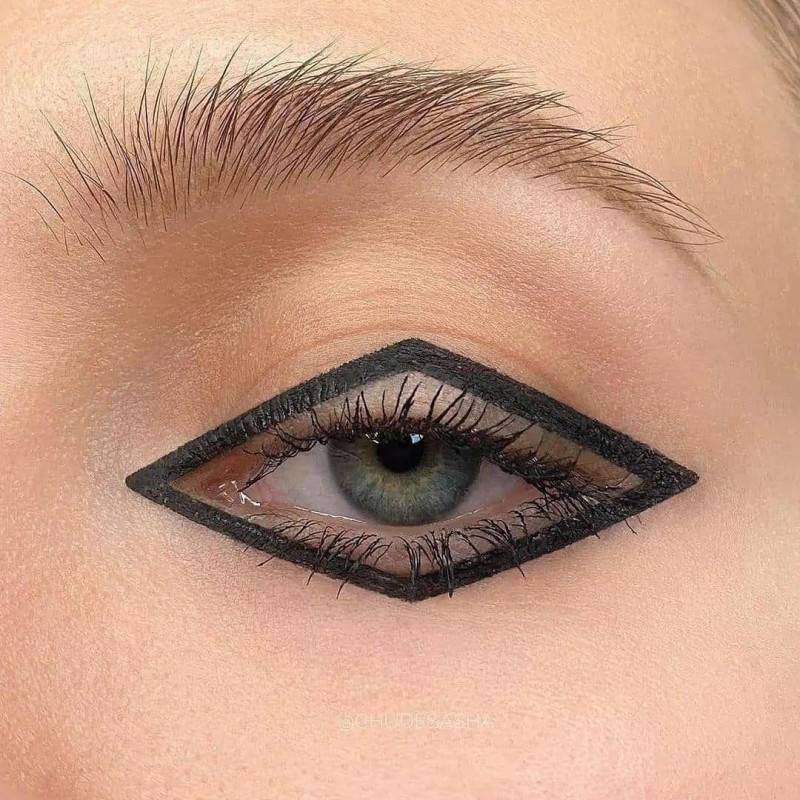Представьте, что вы рисуете классическую стрелку, но, дойдя до внешнего уголка глаза, резко меняете направление — и плавно уводите ее кончик к складке века.