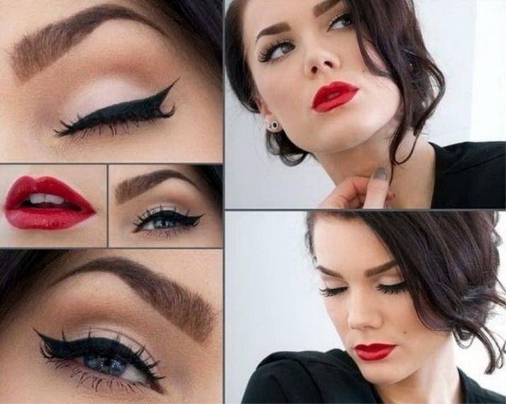 - подчеркивай либо глаза, либо губы — между красной помадой и стрелками выбери что-то одно;