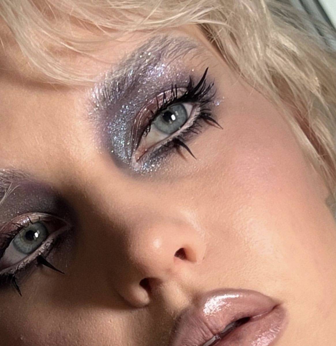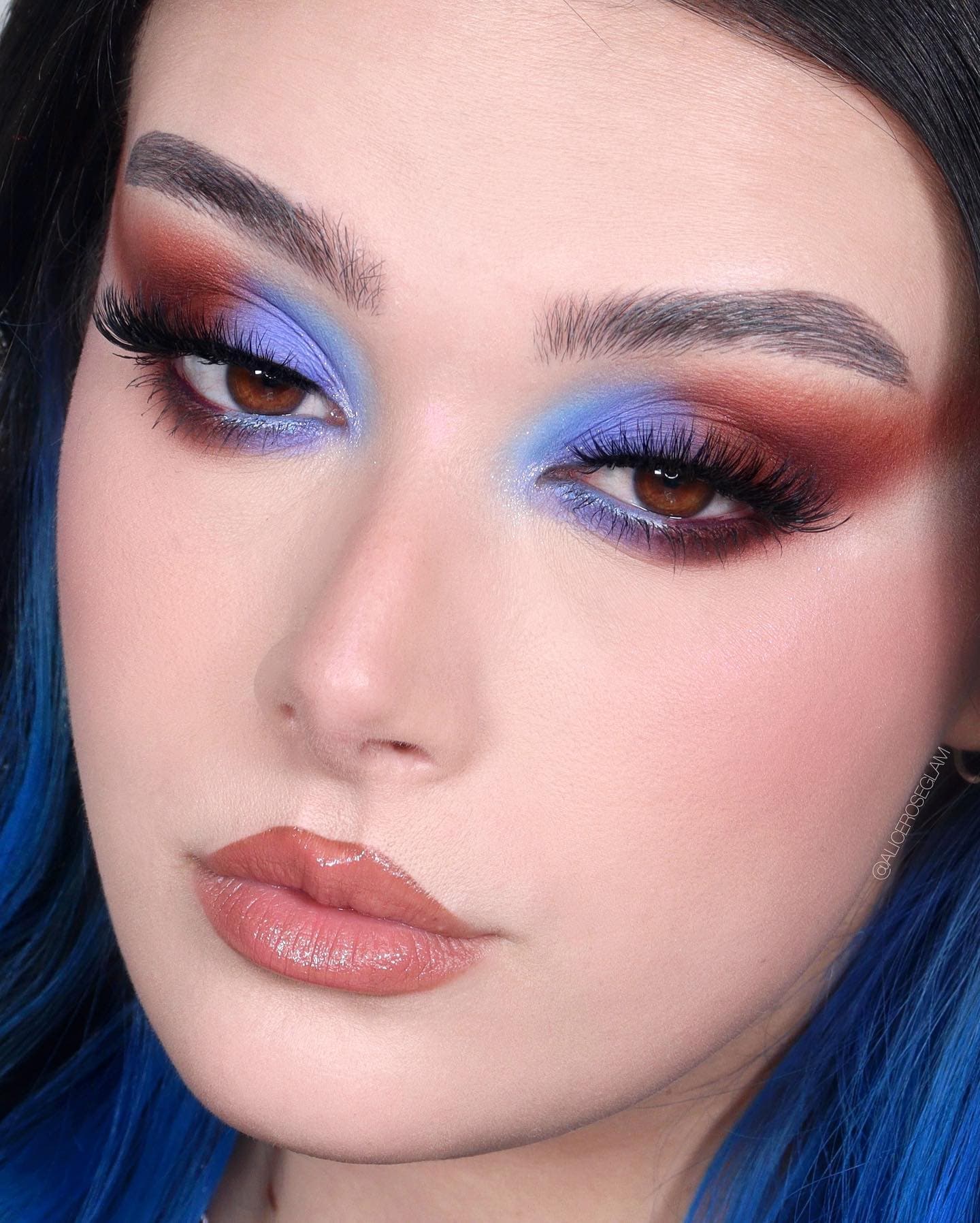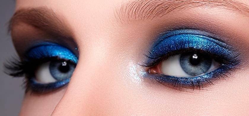 Из доступных цветов чаще всего под синий подойдет вся палитра синего, фиолетовый, черный, белый, золотой, серебро, голографический, в некоторых случаях зеленый. Комбинация цветов приветствуется, поэтому база макияжа существенно расширяется по возможности выбора.