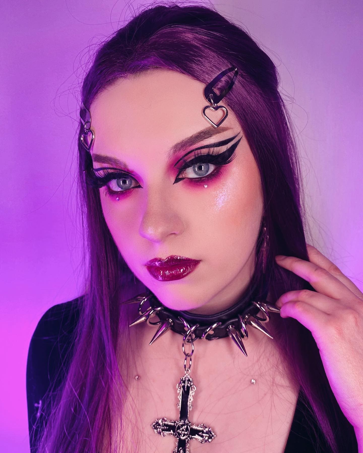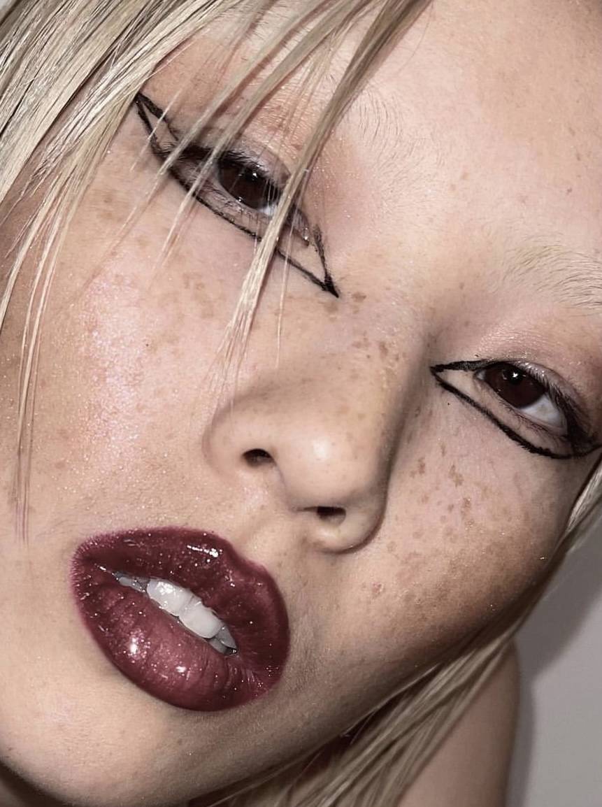 Губы налитые темной губной помадой и имеют четкий контур. Для губ могут использовать тени с кремовой текстурой, если хотят сделать их с отливом и блеском какой-либо палитры цвета.