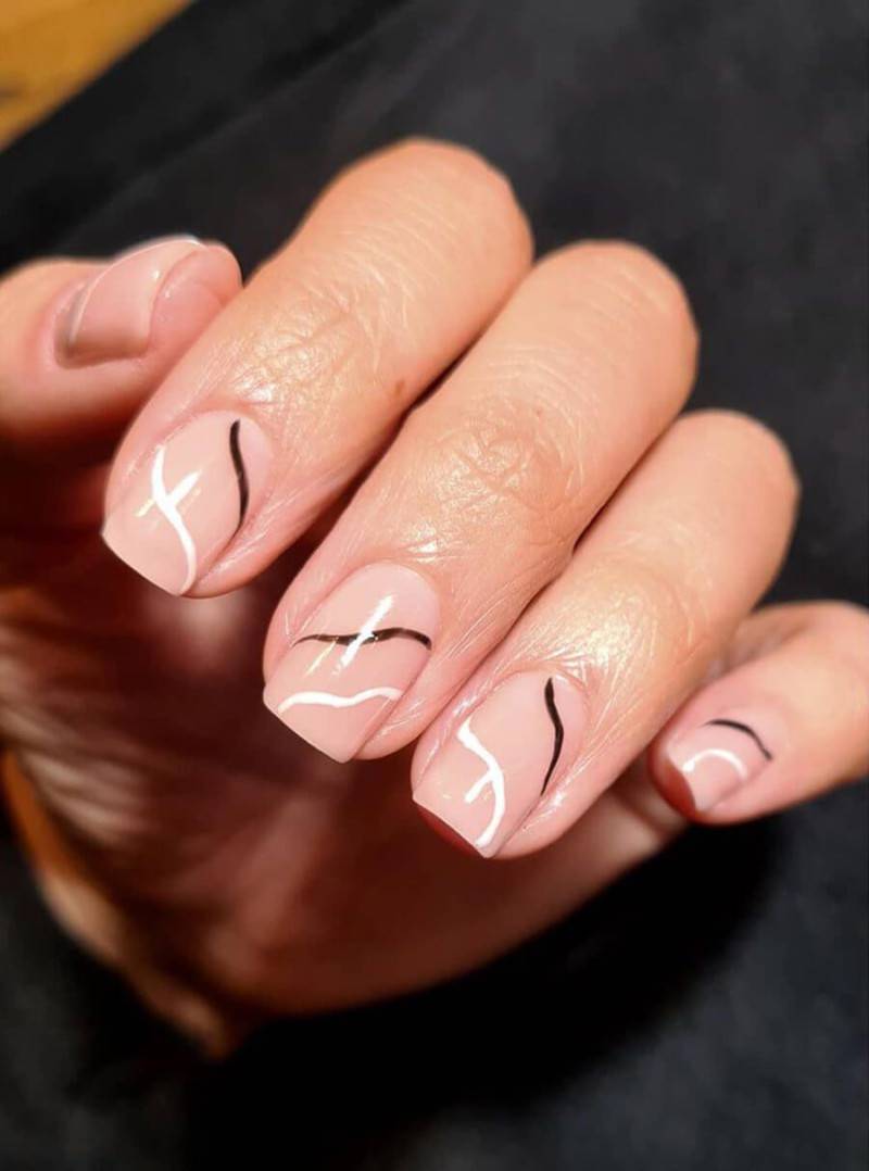 Минимализм. Ногти естественного оттенка с тонкими линиями, крошечными завитками и точками – оригинально и сдержано. Огромный плюс такого решения – ноготь отрастает незаметно, можно отложить коррекцию на несколько дней.